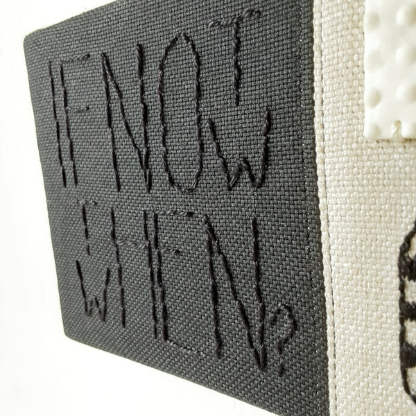 IF NOT NOW THEN WHEN I hand sewed this mixed media art work with embroidery and a ceramic element on a linen look fabric. A unique, graphic look piece of wall art ready to add...